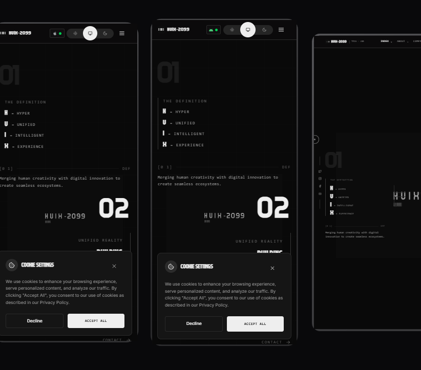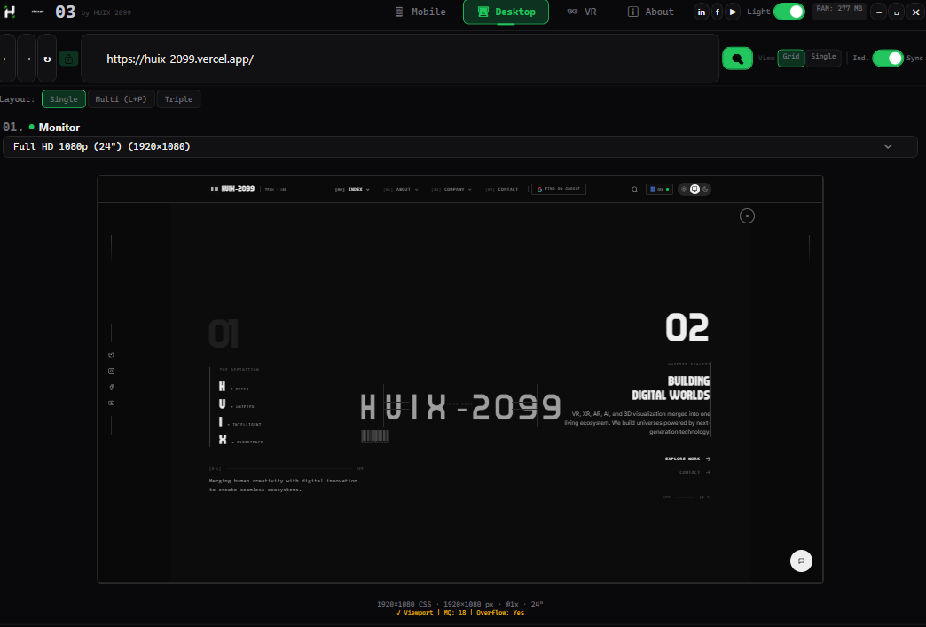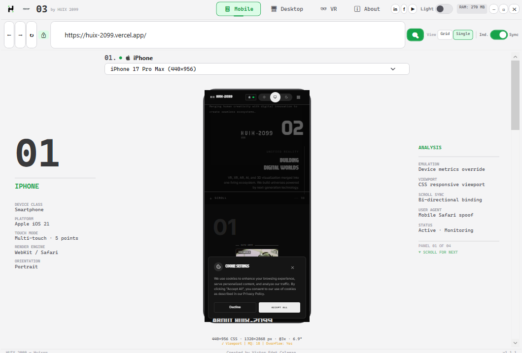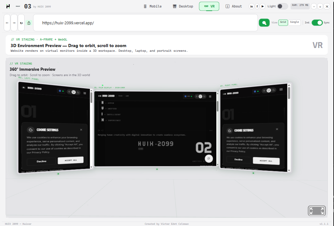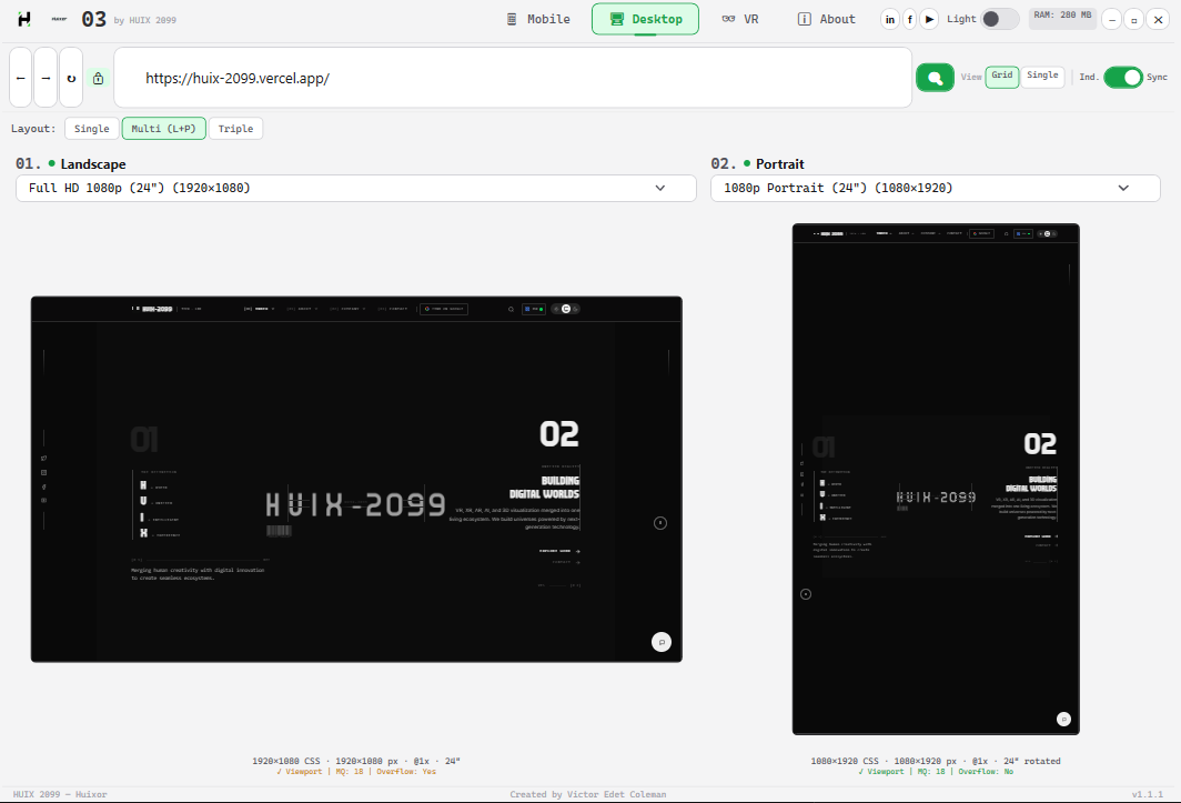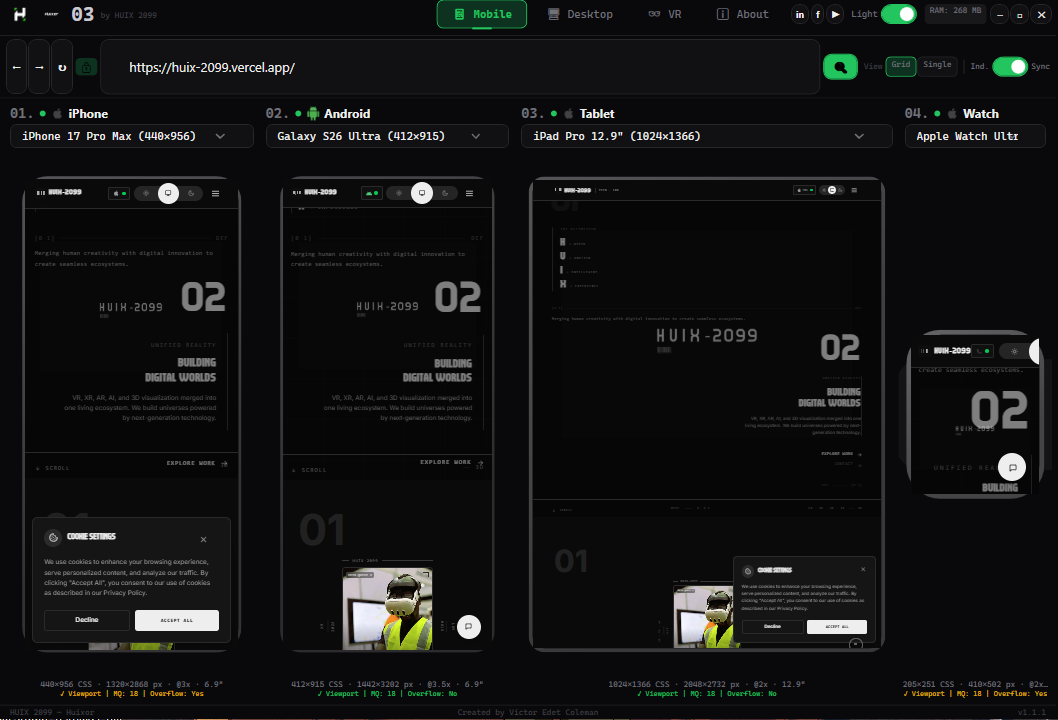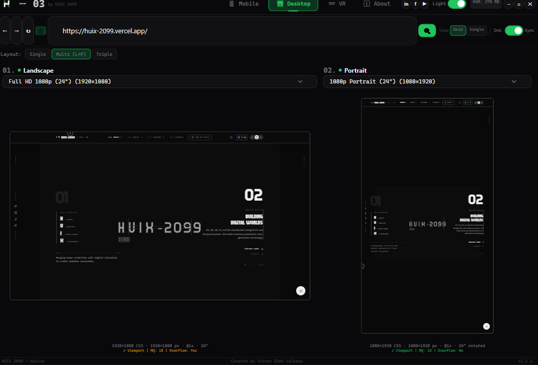 +------------------------------------------------------------------+ | ROW 0: TITLE BAR | | Logo | Version | Nav | Social | Theme | RAM | Controls | +------------------------------------------------------------------+ | ROW 1: URL BAR | | Back Forward Refresh | Lock | URL | Search | View | Scroll | +------------------------------------------------------------------+ | ROW 2: CONTENT AREA | | Mobile / Desktop / VR / About | +------------------------------------------------------------------+ | ROW 3: STATUS BAR | | HUIX 2099 — Huixor | Victor Edet Coleman | v1.1.1 | +------------------------------------------------------------------+