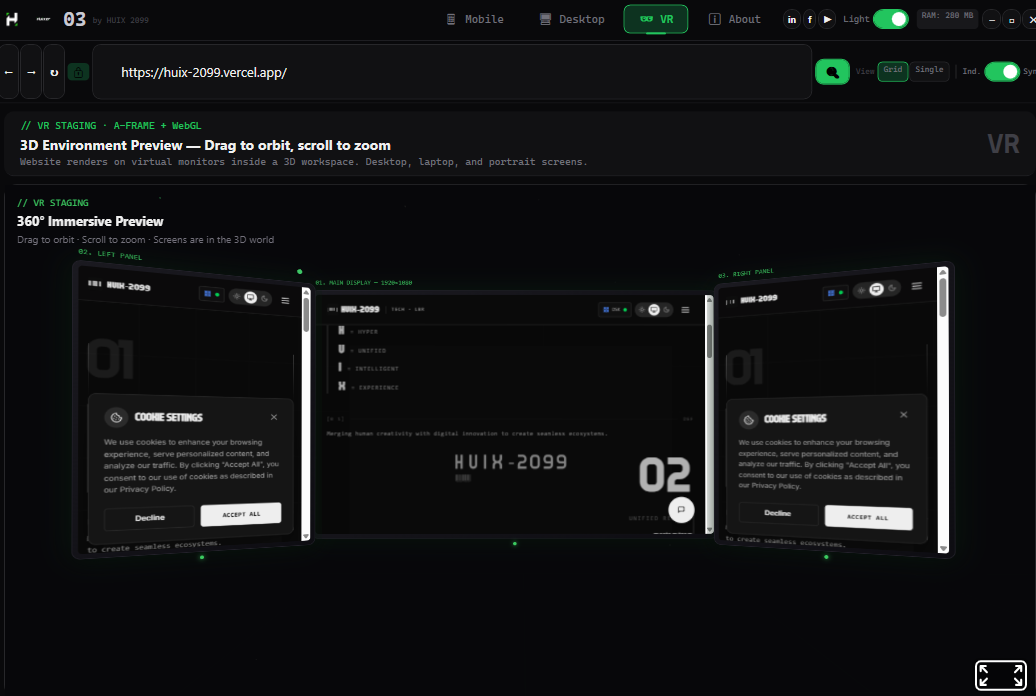 Huixor previews any website across device categories — iPhone, Android, tablet, watch, desktop monitors, and a VR environment — simultaneously in a single window. It is built with WPF + .NET 8 and WebView2, using the Chrome DevTools Protocol for faithful emulation.